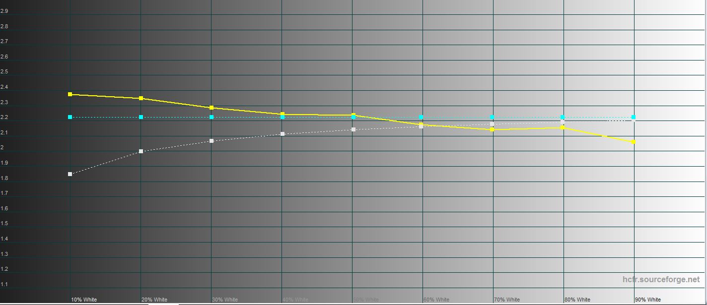In de modus "Standard" ligt het kleurengamma dichter bij de standaard sRGB en is de kleurweergave nauwkeuriger, met minder scheefgroei naar de koelere tinten. Tegelijkertijd bedroeg de maximale helderheid 431,631 cd/m2.