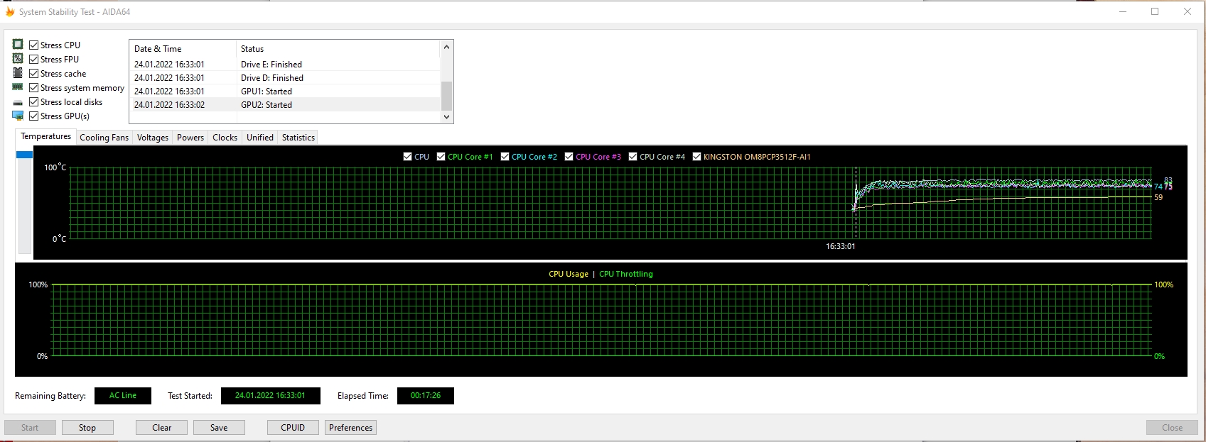 In ons monster wordt een Kingston M.2 NVMe PCIe Gen3 x4 SSD gebruikt als schijf. In onze configuratie is het mogelijk om nog een 2,5" SATA schijf te installeren. Maar er zijn laptop varianten met twee M.2 PCIe Gen3 x4 slots.