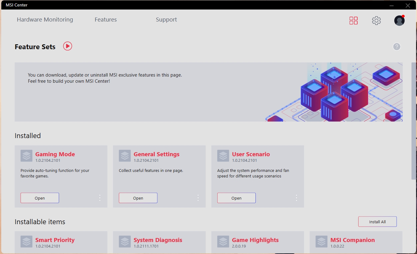 Van de eigen software is MSI Center het vermelden waard. Met de applicatie kunt u de huidige systeemstatus controleren, driver updates downloaden, schakelen tussen gaming, silent, power efficient, balanced, user en ultra performance modes. In de laatste kun je geforceerd de CO-modus activeren op maximale snelheid. Hoewel, zoals de praktijk heeft uitgewezen, in de automatische modus het zonder problemen met verwarming omgaat.