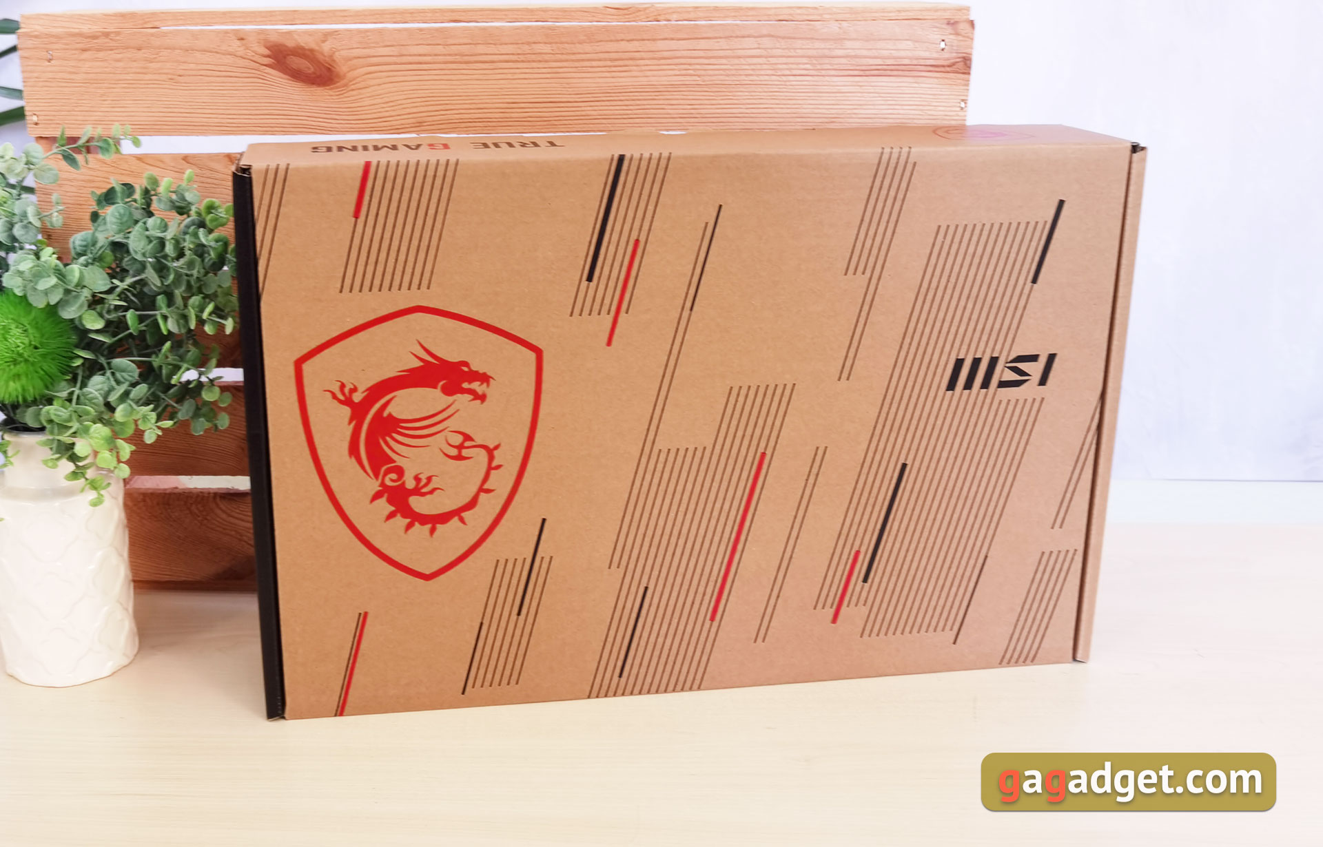 De verpakking van de MSI Katana GF66 11UD is absoluut typisch voor laptops, net als de inhoud. Een mosterdkleurige kartonnen doos met een minimum aan polyritme en alle technische basisinformatie. Binnenin zit een notebook, een 180W voeding, een afneembare stroomkabel en documentatie.