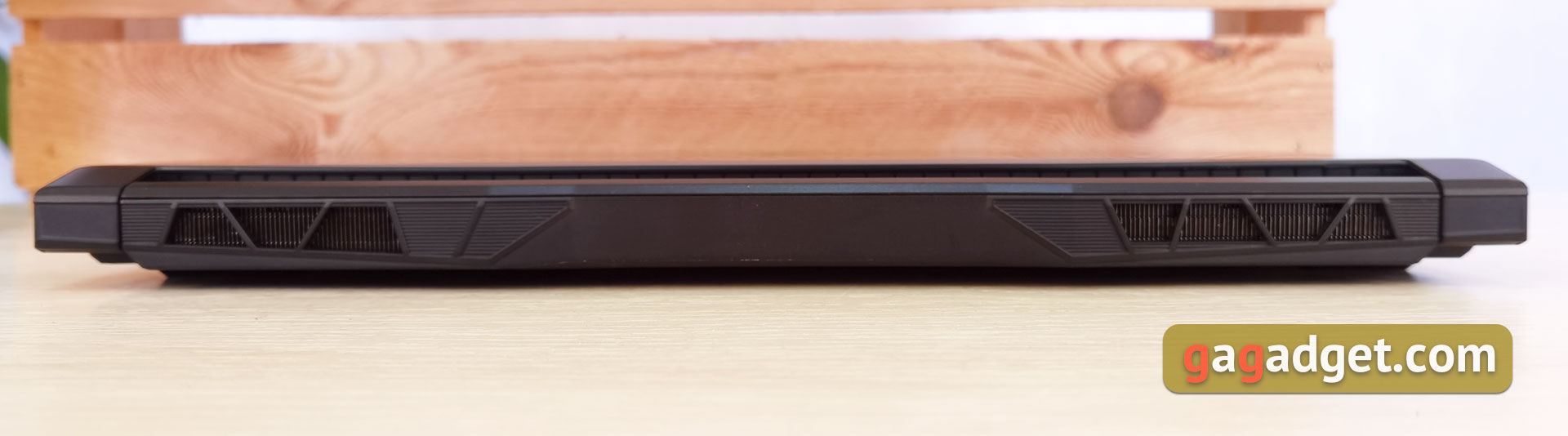 Aan de achterkant hebben ze twee gebieden geplaatst voor hete lucht die wordt uitgeblazen door het koelsysteem, geen connectoren. Er zijn geen functionele elementen aan de voorkant.