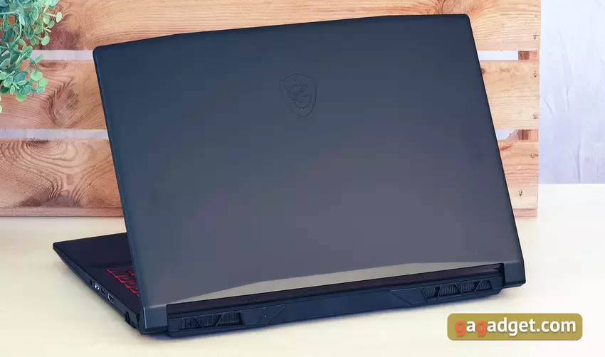Volgens de officiële website was de Japanse illustrator Tsuyoshi Nagano betrokken bij het ontwerp van de MSI Katana GF66 11UD. De laptop ziet er erg ingetogen en sober uit, in tegenstelling tot een stel gamer modellen met achtergrondverlichting uit alle hoeken. In dit geval is er alleen het toetsenbord met achtergrondverlichting. De behuizing is volledig gemaakt van praktisch matzwart plastic. Het verzamelt praktisch geen vingerafdrukken. Het enige modieuze kenmerk is het logo van MSI in reliëf op het bovendeksel.