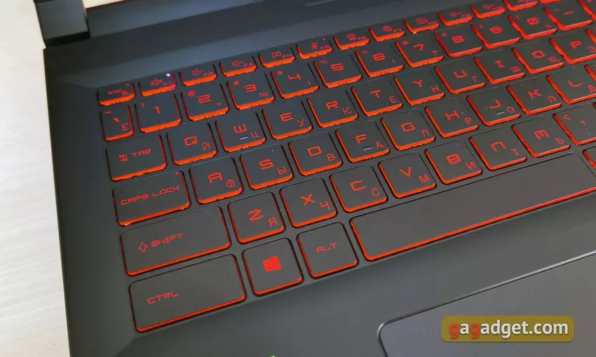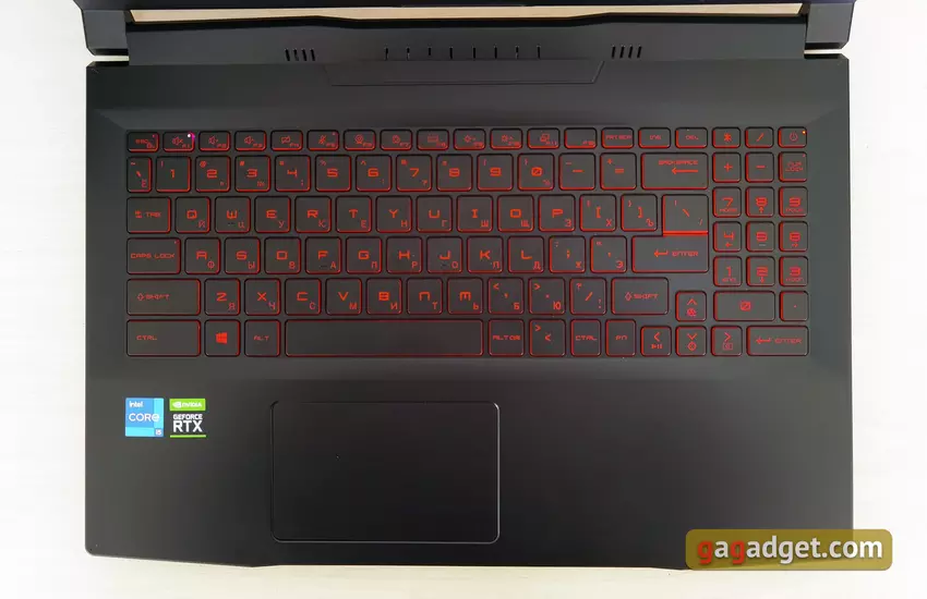 De MSI Katana GF66 11UD heeft een full-size toetsenbord met een extra numeriek toetsenbord, iets wat niet vaak voorkomt op 15.6-inch modellen. Het toetsenbord heeft zijn eigenaardigheden, maar alle meest gebruikte toetsen zitten op hun plaats, dus het duurt niet lang om eraan te wennen. De bovenste rij functietoetsen is iets minder hoog. De linker Shift en Ctrl zijn iets langer dan standaard, Enter is enkelvoudig. Door de aanwezigheid van het cijferblok moest het linker pijlblok iets naar links worden verplaatst, waardoor de rechter Shift iets korter is. Het cijferblok zelf heeft drie in plaats van vier kolommen. De optionele Enter is onder het blok geplaatst, terwijl de + en - erboven zijn geplaatst.