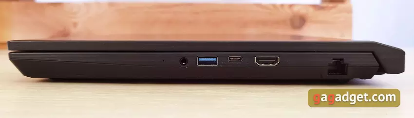 Er zijn geen ventilatiegaten aan de rechterkant, dus er waait geen hete lucht rond je hand en muis. Aansluitingen: 3,5mm audio combo voor headset aansluiting, HDMI (4K/60Hz), USB 3.2 Gen1 Type-C, full-size USB 3.2 Gen1 en RJ-45: