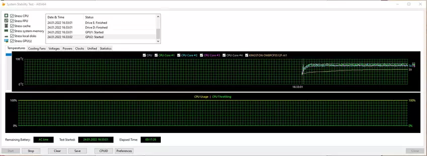 Het Cooler Boost 5 systeem, met 2 ventilatoren, 6 heat pipes en een onafhankelijke thermomodule voor de CPU en de GPU, is verantwoordelijk voor de koeling. Tegelijkertijd worden dunnerwandige heat pipes gebruikt, die hebben geholpen om het kanaal binnenin te verbreden. Het koelsysteem doet zijn werk: zelfs bij continue piekbelasting stijgt de temperatuur van de componenten binnenin niet boven de 80-83°. Er wordt dan ook geen draf waargenomen. Het gebied boven het toetsenbord wordt een beetje warm, terwijl de rest van het werkoppervlak koel blijft. MSI Katana GF66 11UD is een typische gaming notebook. Ja, onder belasting hoor je het geluid van de CO, maar binnen redelijke grenzen.