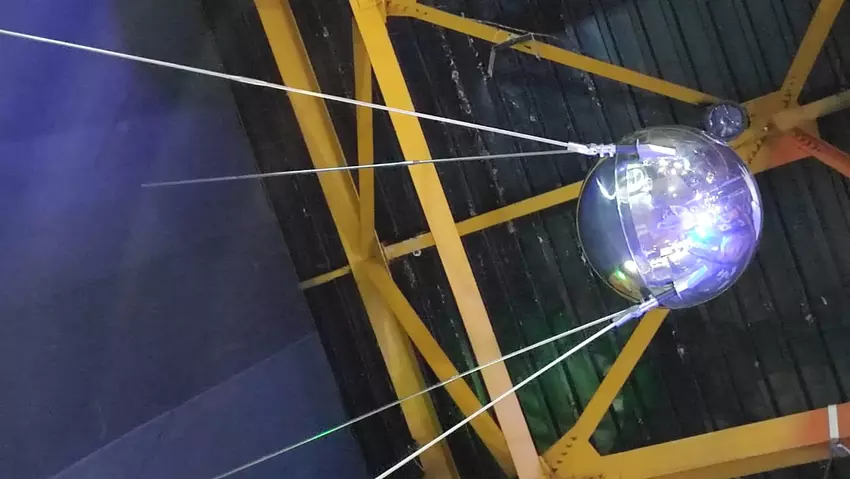 Onder het plafond hangt een levensgroot model van de allereerste kunstmatige satelliet. Officieel heette hij Spoetnik 1. Hij werd op 4 oktober 1957 in een baan om de aarde gebracht met een raket op basis van de intercontinentale tweetraps R-7. Hoewel Korolev, om voor de hand liggende redenen, vooral werkte aan militaire toepassingen voor raketten, was zijn droom de verkenning van de ruimte.