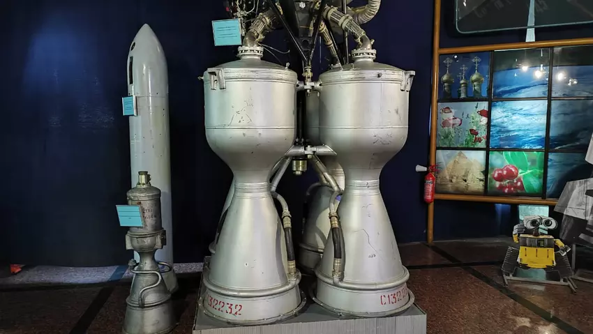 Bij de ingang staat een vloeibare raketmotor RD-214 van de eerste trap van de Kosmos raketwerper. Hij is bijna 2,5 meter hoog en draait de eerste twee minuten van de vlucht van de raket.
