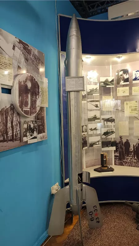 En deze tentoonstelling bleek voor mij een echte ontdekking te zijn - voor u staat een 1:5 schaalmodel van de Korolev kruisraket 212, ontworpen in de periode van 1936 tot 1938. Het was ontworpen voor militaire doeleinden, gelanceerd vanaf een raketslee van 30-60 meter lang en vliegend tot een afstand van 80 kilometer. Vroeger dacht ik dat zulke dingen pas in de jaren veertig opdoken met Wernher von Braun.