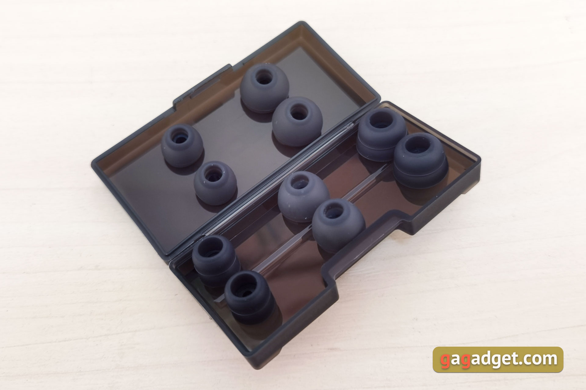 Dankzij de grote buitenpanelen is het gemakkelijk en comfortabel om je vingers op de sensoren van de hoofdtelefoon te krijgen. Het standaard bedieningsschema is best handig, maar het kan worden gewijzigd in de eigen app. De standaard enkele tik op beide oortjes is afspelen/pauzeren, het gesprek beantwoorden. Dubbele en driedubbele tap op het rechteroorstuk - track switching, dubbele en driedubbele tap op het linkeroorstuk - volumeregeling, lange tap - lancering van de spraakassistent.