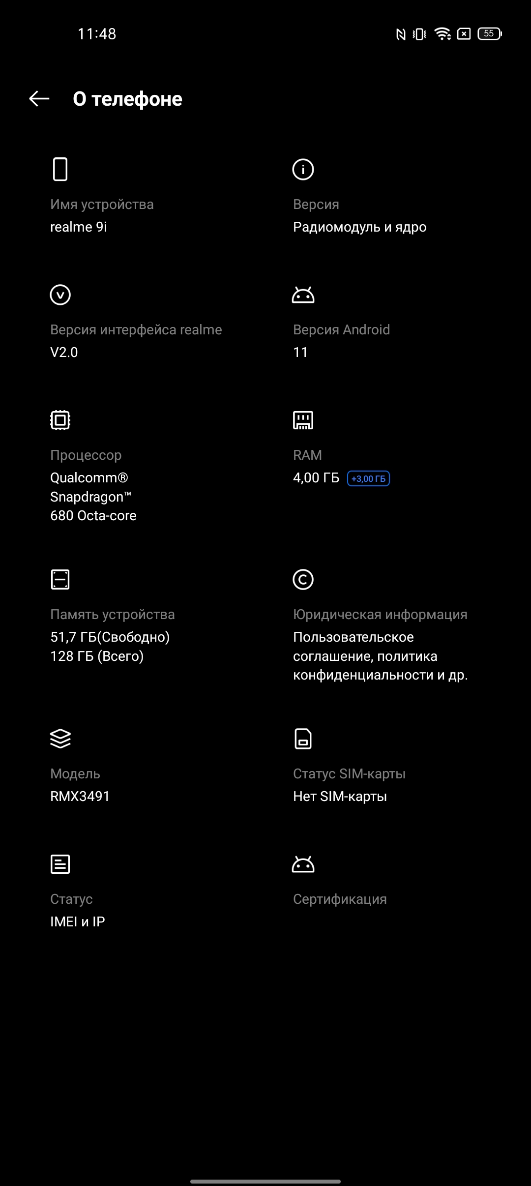 De realme 9i heeft een verse maar relatief bescheiden Snapdragon 680-processor, die Qualcomm afgelopen najaar onthulde. Het is een octa-core processor, die is vervaardigd met behulp van 6nm-procestechnologie, bevat vier 2,4GHz Kryo 265 Gold-kernen en vier 1,9GHz Kryo 265 Silver-kernen. De Adreno 610 versneller is verantwoordelijk voor de graphics. In feite kunnen we het een soort bijgewerkte versie van de oude 11-nanometer Snapdragon 665 noemen: bijgewerkte kernen Kryo 265 (kwam ter vervanging van de Kryo 260), draaiend op hogere frequenties, dezelfde grafische versneller en de nieuwe procestechnologie. Het RAM is 4 GB, wat naar huidige maatstaven niet genoeg is. Er is een optie om het RAM uit te breiden met 1/2/3 GB interne opslag, maar dat maakt niet echt een verschil. De capaciteit van de interne opslag is 128 GB, er is een sleuf voor geheugenkaarten. De resultaten in synthetische prestatietests zijn niet hoog: