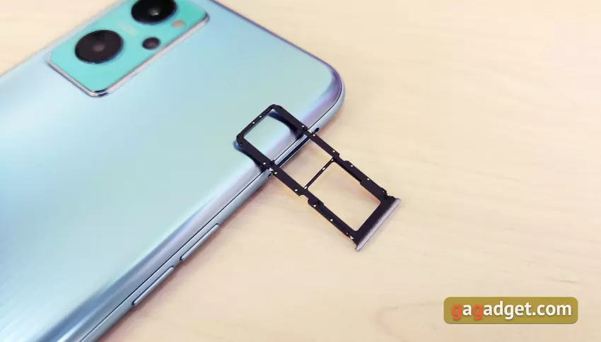 De volume- en aan/uit-knoppen zijn aan weerszijden van de smartphone geplaatst, een bekend patroon voor smartphones realme en OPPO. De powerknop is gecombineerd met een vingerafdrukscanner. Het is geplaatst op een vrij handige hoogte, je hoeft er niet naar te reiken met je duim als je de smartphone met de rechterhand gebruikt, noch met de wijsvinger van de linkerhand. De lade bevindt zich aan de linkerkant, net boven de aan/uit-knoppen.