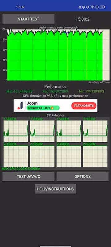 Met de stabiliteit van het werk onder belasting is alles normaal. CPU Throttling Test laat geen merkbare oververhitting zien, de prestaties kunnen tot 93% dalen. De smartphone zelf wordt nauwelijks warm.