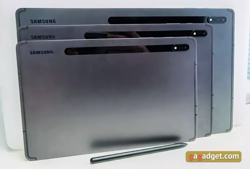 Er zijn maar liefst drie nieuwe flagship tablets dit jaar. Het belangrijkste verschil tussen hen is het formaat, de resolutie en het type scherm dat wordt gebruikt. Alle drie de modellen zijn groot: de kleinste diagonaal is 11 inch. Anders - vergelijkbaar ontwerp, metalen dunne behuizing, ondersteuning voor mobiele netwerken, S Pen (en magnetische bevestiging aan de achterkant) en vier luidsprekers elk met Dolby Atmos-ondersteuning. Gedetailleerde specs: