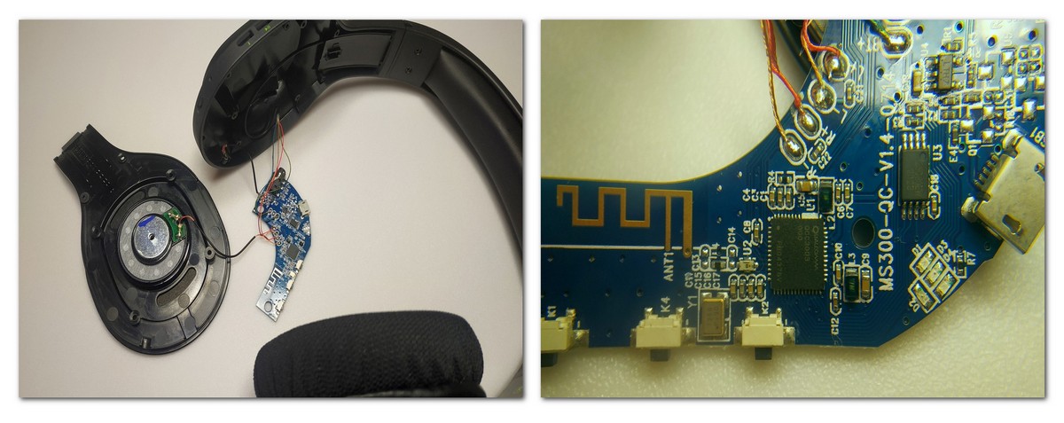 Om de oorzaak beter te begrijpen, hebben we de hoofdtelefoon uit elkaar gehaald. Hij is gemaakt op de SoC QCC3003 van Qualcomm, zoals we hierboven al schreven. De chip zelf is over het algemeen niet slecht. Als je een versterker op zijn uitgang aansluit, is alles goed met de frequenties. Hij heeft alleen niet genoeg vermogen om zulke grote radiatoren aan te sturen bij het afspelen van dynamische muziek.
