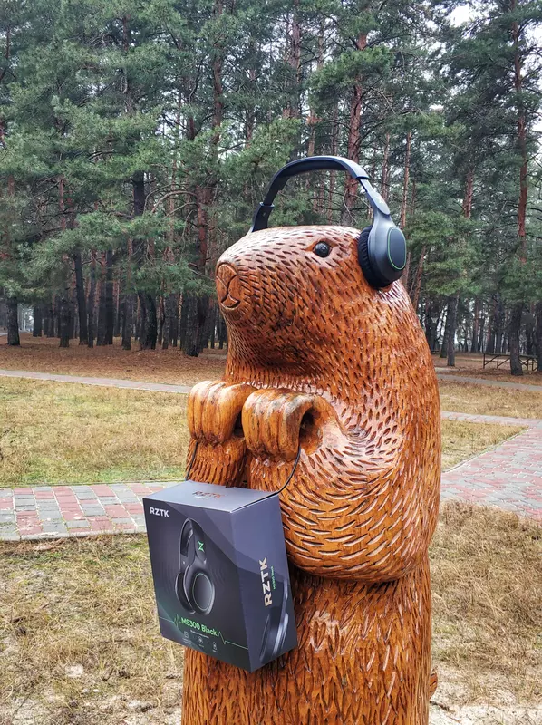 De knappe verpakking in zwart en grijs met groene en zilveren letters is zeer goed gemaakt. Het ontwerp maakt gebruik van glanzende en matte gebieden. De hoofdtelefoon wordt vastgehouden op een kartonnen "piramide" en is versierd in het zwarte en groene RZTK kleurenschema. In de hoofdtelefoon zit een 30 centimeter lange micro-USB-oplaadkabel. Houd hier rekening mee bij de aanschaf als u een langere lengte nodig heeft. En een 1,2 meter lange soft-touch 3,5 mm mini-Jack audiokabel. Op de kabel zit een blokje met "+", "-" en ">||" knoppen, die gebruikt kunnen worden om de hoofdtelefoon bedraad op de telefoon aan te sluiten. Ook zit er in de doos een korte instructie in het Oekraïens en Russisch.