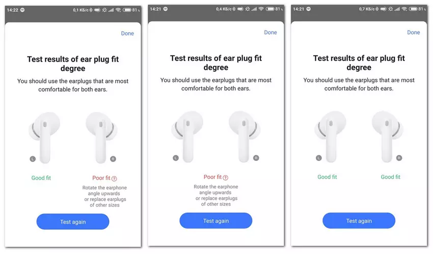 Eerst controleren we of de oorkussens de juiste maat hebben en of het oorstukje goed in de gehoorgang zit. Ga hiervoor naar het instellingenmenu "Apparaatinstellingen" en voer daar "Ear Tip Fit Test" uit, luister naar korte deuntjes en draai het oorstukje in het oor tot er twee groene "Good fit" verschijnen. Zo krijgt u maximale geluidsisolatie, zowel passief, door de vormfactor van de oortelefoon, als actief. En tegelijkertijd krijgt u de maximale kwaliteit van muziek en andere geluiden.