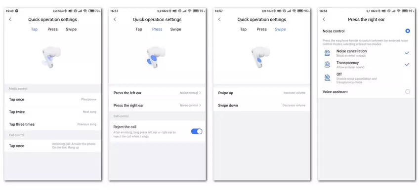 Als u 2 seconden lang drukt, wordt de ruisonderdrukkingsmodus omgeschakeld tussen twee of drie standen, of wordt de stemassistent opgeroepen, die persoonlijk kan worden geconfigureerd voor verschillende oortelefoons. De linker schakelt bijvoorbeeld tussen actieve ruisonderdrukking en transparante modus, terwijl de rechter de assistent inschakelt. Of de linker schakelt tussen actieve ruisonderdrukking en transparante modus, en de rechter schakelt tussen actief en passief. Als er een oproep binnenkomt, kan deze met een tikje worden geweigerd. En deze functie kan worden uitgeschakeld.
