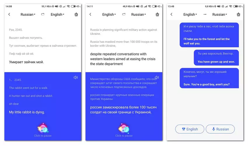 De app kan werken als een simultane audiotolk van/naar 45 talen (op het moment van schrijven) waaronder Oekraïens en Russisch. Gebruik hiervoor een van de onderdelen van de sectie Intelligent tolken. De vertaling is vrij snel en duidelijk, wat in het begin een beetje eng is, waardoor je je afvraagt wat de vooruitzichten zijn voor het beroep van "vertaler".