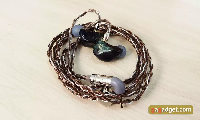 De hoofdtelefoon wordt geleverd met een zeer hoogwaardige Furukawa 8-aderige monokristalkoperen kabel. Deze is zacht, buigzaam en raakt niet in de knoop. De oorkussens zijn van niet-verwijderbaar silicone, en de verstelbare verdeler is van metaal. Maar het handigste ontwerp is de afneembare aansluiting, die gemakkelijk kan worden veranderd in de juiste, afhankelijk van de bron waarop u aansluit.