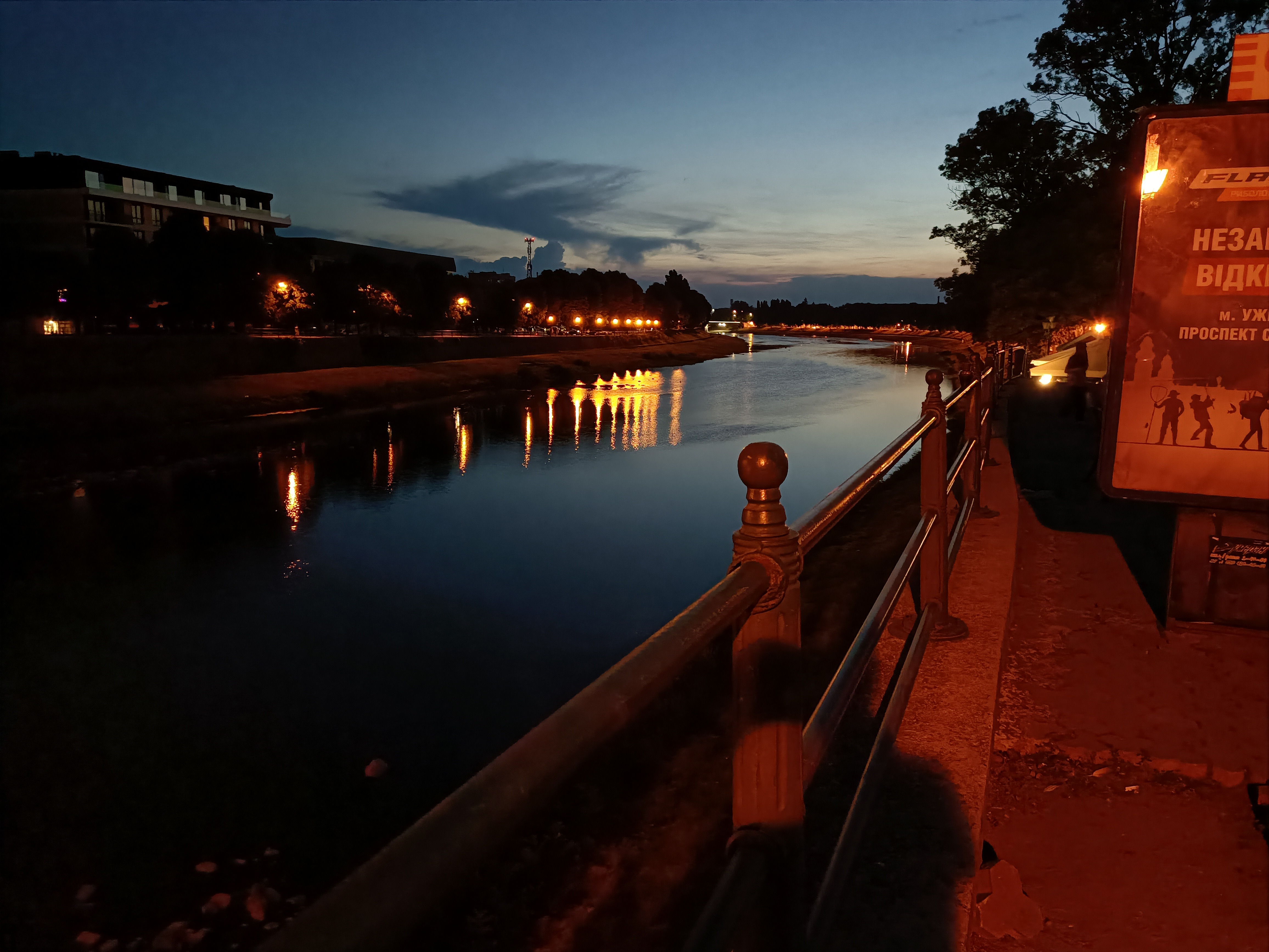 En bij slechte lichtomstandigheden helpt de nachtmodus. Te oordelen naar de parameters van de testopnamen vermindert de camera in deze modus automatisch de gevoeligheid en compenseert dit door de sluitertijd te verhogen. En natuurlijk wordt het verschil bij gebruik van twee verschillende camera's (hoofd- en groothoek) zeer merkbaar. Hier is een voorbeeld van een opname die onder dezelfde omstandigheden met twee verschillende camera's is gemaakt. De effectiviteit van de nachtmodus is duidelijk.