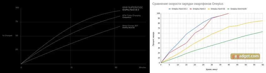 65-watt SUPERVOOC lader werkt zeer effectief. Maar alleen als u een eigen oplaadkabel gebruikt, want met een goedkope kabel uit de dichtstbijzijnde winkel gaat u rechtstreeks terug naar de jaren 2010. En in 2022 is de Nord CE 2 met een batterij van 4.500mAh in 38 minuten volledig opgeladen, met slechts zes minuten voor een lading van 20 procent. Dat is ongeveer hetzelfde resultaat als de Nord 2. Na het zien van een vergelijkende grafiek op de officiële website van de oplaadsnelheden van verschillende Oneplus-modellen (links afgebeeld), besloot ik mijn aantekeningen erbij te pakken en een soortgelijke te maken op basis van mijn eigen gegevens (rechts). Het is een beetje ruk, maar helemaal waar.