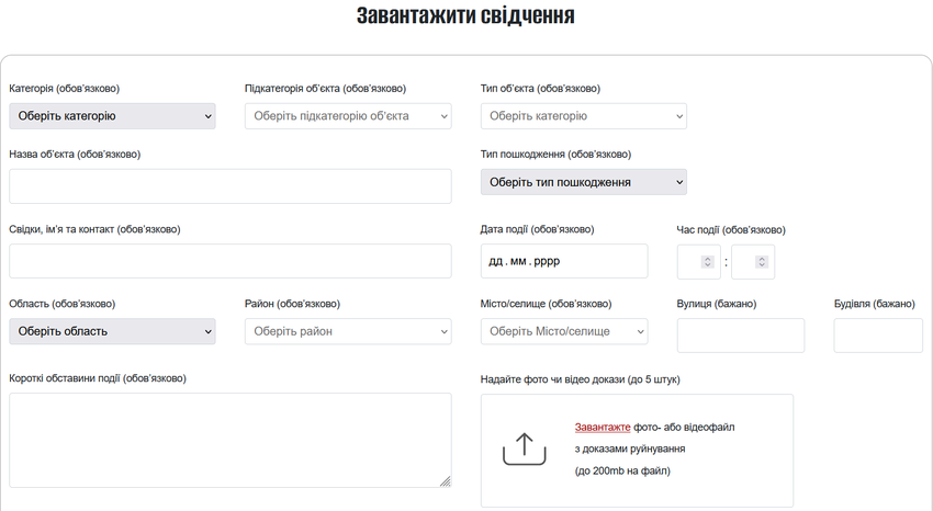 Iedereen kan informatie verstrekken over de vernielingen en schade die door de Russische agressie zijn veroorzaakt. Het type en de naam van de installatie, de stad en de regio waar de installatie zich bevindt, en de datum van vernietiging moeten worden verstrekt. Het is belangrijk gegevens te verzamelen over de vernietiging van infrastructuur, grote administratieve faciliteiten en gebouwen met meerdere verdiepingen: bruggen, luchthavens, scholen, ziekenhuizen. Om dit te doen - moet u een speciaal formulier invullen op.