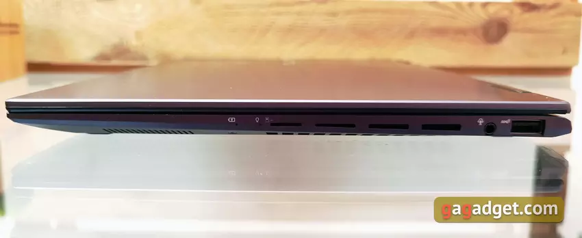 De ASUS Zenbook 14 Flip OLED is een ultradraagbaar model, dus de poortenset is vrij bescheiden, hoewel alle essentials aanwezig zijn. De rechterkant heeft 1 USB 3.2 Gen 2 Type-A poort, een 3,5mm combo audio jack, een microSD kaartlezer, LED indicatoren en ventilatieopeningen.