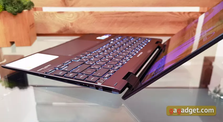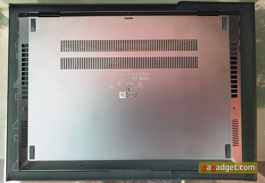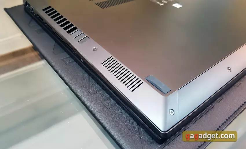 Aan de voorkant is een uitsparing voor het makkelijker openen van de laptop. Dus al met al, structureel, is alles vrij vertrouwd, op zijn plaats.