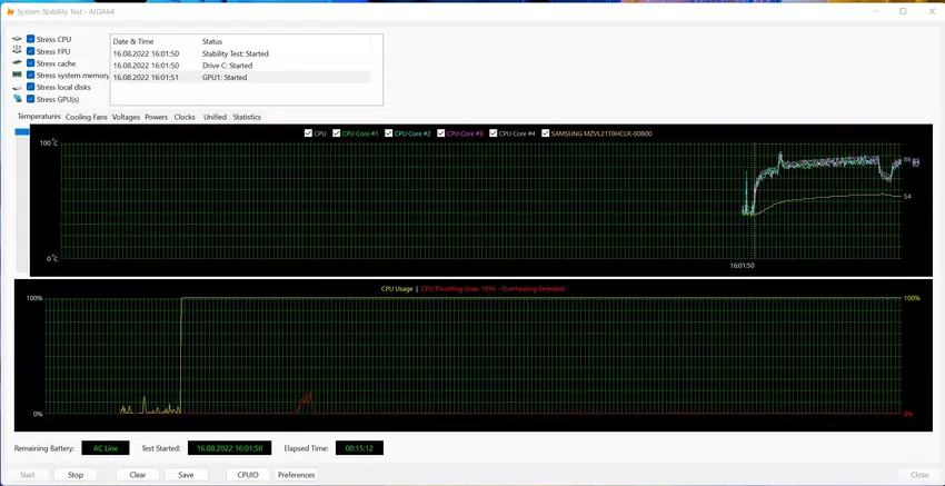 Bij lage belasting zijn de ventilatoren onhoorbaar. Maar bij maximale "rpm" is het geluidsniveau vrij hoog. Niet zo luid als een gaming model, natuurlijk, maar doorgaans zijn ultraportables wat stiller. In de AIDA64 stresstest bij maximale belasting loopt de temperatuur van de componenten eerst op tot ongeveer 93°, er is een trouting van 19%. Daarna past het koelsysteem zich aan, de temperatuur komt niet boven de 80-85° en het systeem draait op vol vermogen. Het gehele werkoppervlak blijft koel onder alle belastingen.