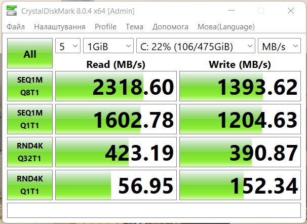 De prestaties van de SSD zijn iets sneller dan geadverteerd. Lezen is ongeveer 2300 MB/s en schrijven 1400 MB/s: