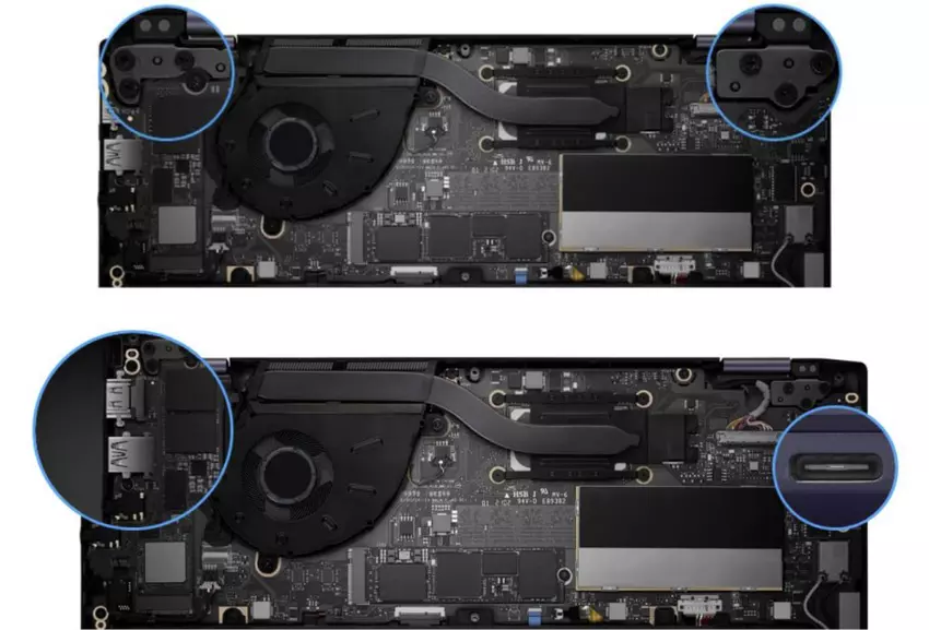 De onderkant van de laptop heeft veel gaten voor ventilatie. Aan de achterkant is er een rubberen inzetstuk bijna over de hele breedte van de notebook, aan de voorkant zijn er nog twee rubberen voetjes voor een stevige positie op tafel. Dichter bij de voorkant van de notebook zitten stereoluidsprekers aan de zijkanten. De bodemdeksel is bevestigd met tien standaard kruiskopschroeven, dus het zou niet al te moeilijk moeten zijn om te verwijderen. Dit geeft je de mogelijkheid om een tweede M.2 SSD te vervangen of toe te voegen. Deze kunnen werken in RAID0/1 modi. Er is ook één vrij RAM-slot. Niet slecht genoeg voor zo'n compact model.