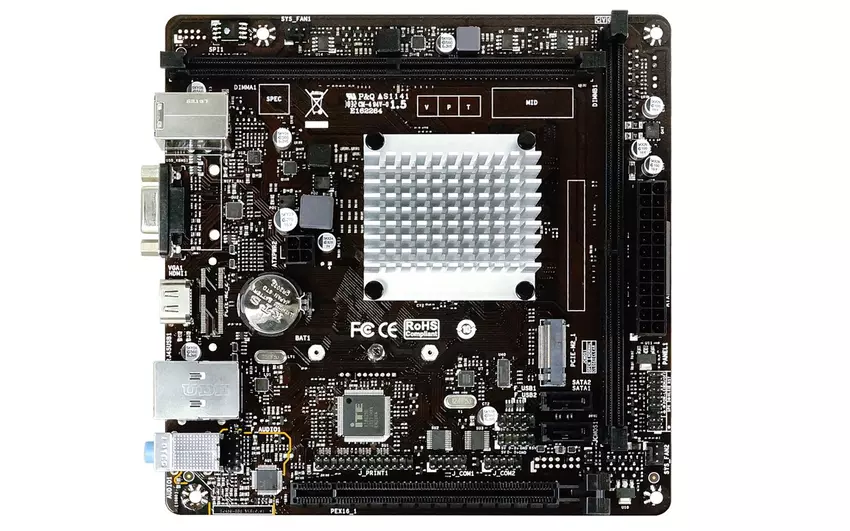 In tegenstelling tot de meeste andere moederborden met soldeed-in CPU's, werkt Biostar's creatie met full-size DIMM RAM in plaats van laptop SO-DIMM. Er is ook een PCIe x16 grafische kaart slot, dat gebruikt kan worden voor elke uitbreidingskaart: geluid, netwerk, video. Of voor een SATA poort uitbreidingskaart om een multi-drive NAS te maken, want het moederbord heeft er zelf maar twee. Maar er is één M.2 slot voor een SSD, zij het beperkt tot PCIe 2.0 x2 snelheid.