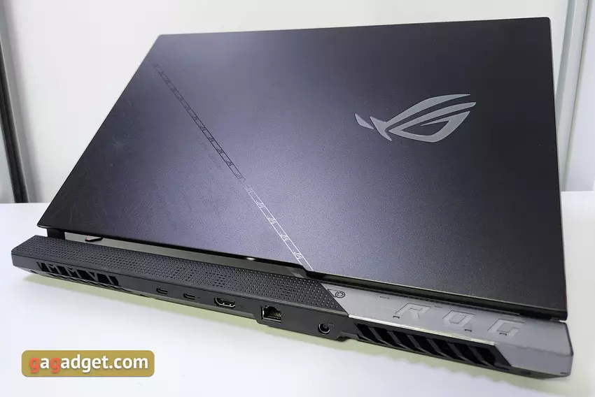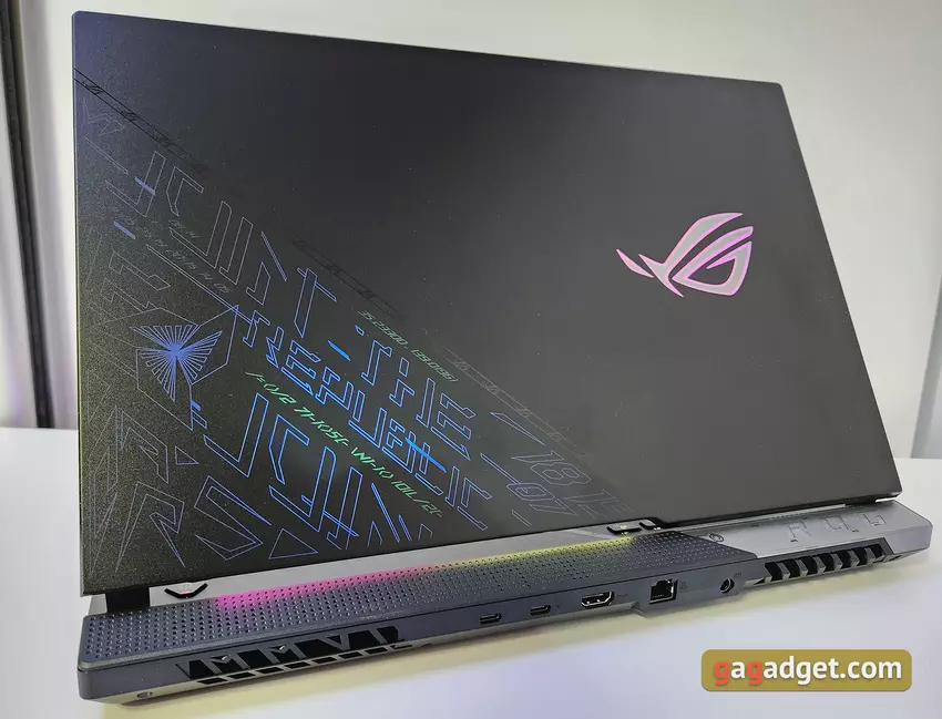 De ASUS ROG Strix Scar 17 SE (2022) is een grote en vrij zware (3kg) laptop, dus hij zal niet erg comfortabel zijn om dagelijks mee te nemen. In principe worden dergelijke modellen gekozen als desktopvervanger. Bovendien is het vermogen heel geschikt voor dergelijke doeleinden. De laptop is gemaakt van hoogwaardig zwart ruw plastic. De traditie van de laatste jaren voortzettend, is de bovenklep diagonaal in twee delen verdeeld. Een van de interessante kenmerken is het ontwerp, dat in speciale inkt is gedrukt. Het is alleen zichtbaar onder ultraviolet licht. Een ander decoratief element zijn de verwisselbare pads Armor Caps met de mogelijkheid tot personalisatie: er zitten er drie in de set, en je kunt er ook zelf een printen op een 3D-printer.