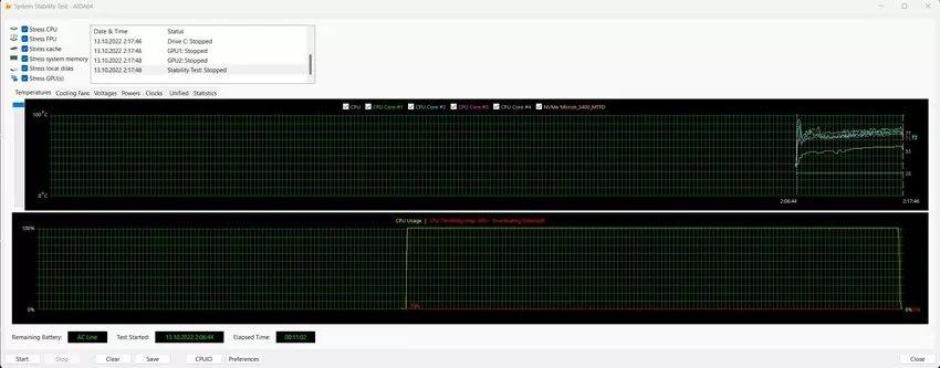 Onder minimale belasting is het koelsysteem onhoorbaar, maar onder maximale belasting is het behoorlijk luid. Wat niet verwonderlijk is, gezien het vermogen van de notebook. De behuizing krijgt bijna geen warmte. Het gebied boven het toetsenbord is merkbaar warmer. AIDA64 stress test toonde aan dat onder maximale belasting, de eerste 30 seconden of zo van de werking de interne componenten opwarmen tot ongeveer 95°, lichte draf op 8%. Na aanpassing van de CO blijft de temperatuur rond de 80° en draait het systeem absoluut stabiel.