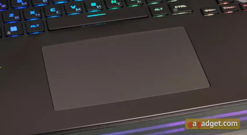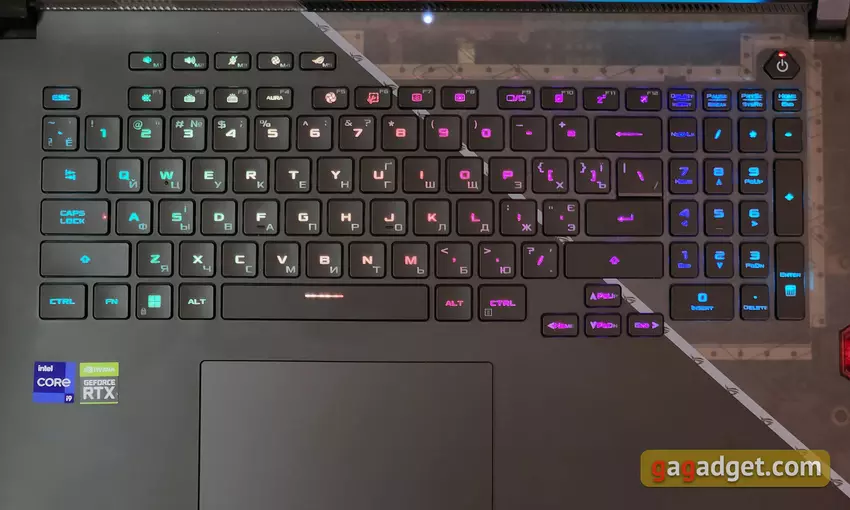De scharnieren vergrendelen het beeldscherm vrij goed in positie. Het scherm wiebelt niet als je er per ongeluk met je hand tegenaan stoot. Van de kleine dingen met betrekking tot de cover kan alleen een klein lipje worden toegevoegd, dat helpt om het op te pakken met je vinger bij het afscheuren. Het toetsenbord in de ASUS ROG Strix SCAR 17 SE (2022) is van volledig formaat, met een apart numeriek toetsenbord. Het is niet gescheiden van de hoofdeenheid. In alle andere opzichten komt de indeling dicht in de buurt van conventionele toetsenborden. Zowel Shift als Enter zijn lang. De bovenste functierij is minder hoog. Daarboven bevinden zich vijf extra toetsen. Standaard zijn ze verantwoordelijk voor volumeregeling, microfoon dempen, modusschakeling en het starten van de Armoury Crate app. Hierop kunnen ook macro's worden ingesteld. Het pijltjespad is ook minder hoog, maar staat iets los van het hoofdpad, zodat het comfortabel te gebruiken is. De powerknop is ook iets los en bevindt zich in de rechterbovenhoek. Al met al duurt het niet lang om aan het toetsenbord te wennen, de indeling is comfortabel.