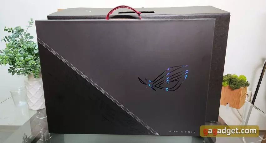 De bovenklep is interessanter. Het is het enige metalen element van de laptop. Het is ook diagonaal in twee delen verdeeld. Aan de bovenkant is een groot backlit Republic of Gamers logo. Aan de onderkant is een speciaal geïnkt ontwerp. Het is alleen zichtbaar onder ultraviolet licht, daarom bevat de verpakking een UV zaklamp.