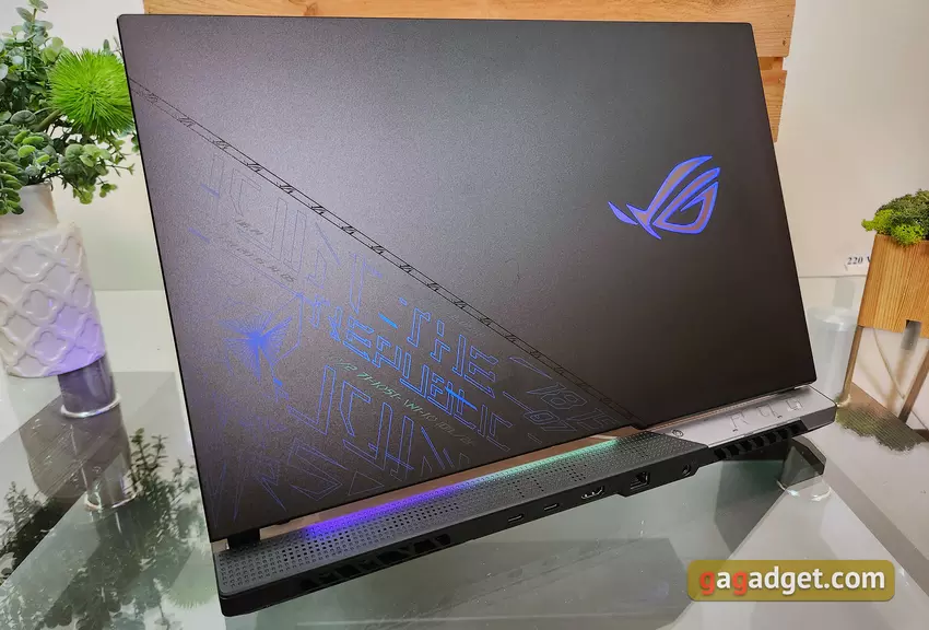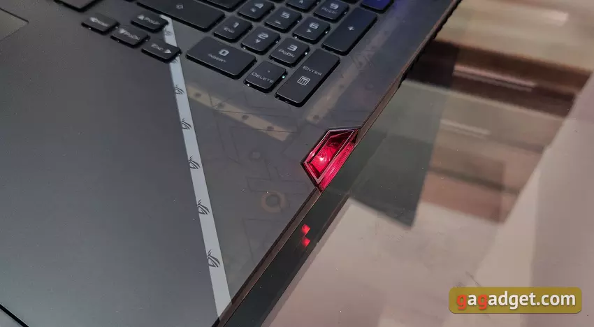 Het frame aan de bovenkant en zijkanten van het scherm is erg dun, met beschermende rubberen inzetstukken rondom. Er is geen webcam. Soortgelijke oplossingen zaten eerder in de ASUS ROG Zephyrus reeks. Het bedrijf schrijft dit toe aan het feit dat de ingebouwde camera niet zo handig is voor streaming als een externe camera, waarmee je de kijkhoek kunt veranderen. En dergelijke laptops worden vaak gebruikt door streamers, die in de meeste gevallen al een aparte, hoogwaardige camera hebben.
