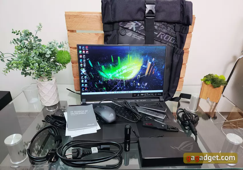 De ASUS ROG Strix Scar 17 SE (2022) is verkrijgbaar met verschillende kits, de maximale versie kwam voor onze review. De laptop is verpakt in een grote, gewichtige zwarte doos. Daarbinnen zit traditioneel nog een kleinere en wat accessoires. Ons pakket bevat, misschien, alles wat je kunt bedenken. De laptop zelf, een 330W hoofdvoeding met stroomkabel, een extra 100W PSU met Type-C en een aparte stroomkabel, twee extra Armor Caps, een ROG Impact muis, een UV zaklamp, een Keystone NFC tag met sleutelhanger, en een zeer handige rugzak om hem mee te nemen. Het enige wat ontbreekt is een externe webcam, want die is niet ingebouwd.