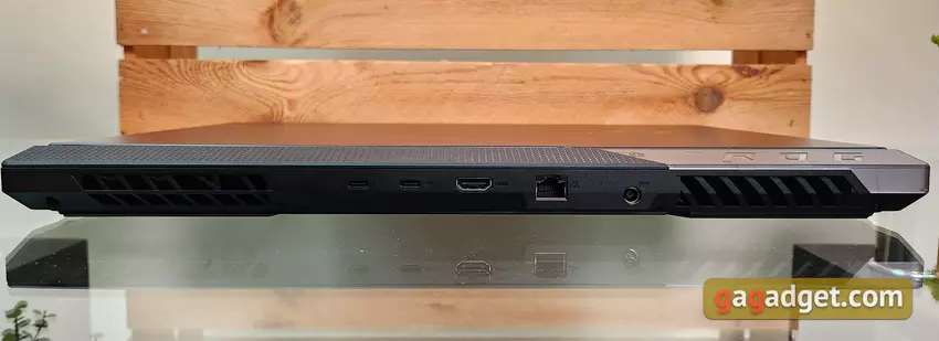 Al het andere zit aan de achterkant: een voedingsaansluiting, Thunderbolt 4 (DisplayPort compatibel), USB Type-C 3.2 Gen 2 (DisplayPort en Power Delivery compatibel), HDMI 2.1, en RJ-45 (LAN). Aan de zijkanten van de aansluitingen zitten luchtopeningen. Gezien de grootte van de notebook en het feit dat dergelijke modellen vaak worden gebruikt voor het maken van foto- en videocontent, is het een beetje vreemd dat er geen kaartlezer is.