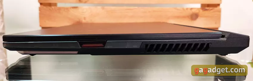 Er zijn geen functionele elementen op de voorkant van de laptop, alleen een decoratieve RGB gestreepte achtergrondverlichting. Natuurlijk kan deze worden uitgeschakeld zoals elke andere achtergrondverlichting op een notebook.