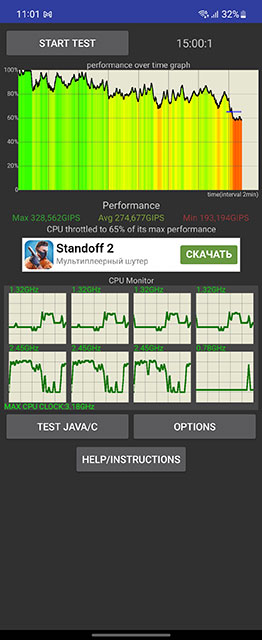 Maar net als de vorige generatie heeft de Samsung Galaxy Flip4 wat problemen met oververhitting. Gezien de ontwerpkenmerken is het inderdaad duidelijk dat de indeling erg strak is en dat de processoren van het vlaggenschip altijd warm zijn. De CPU Throttling Test toonde aan dat de CPU gevoelig is voor oververhitting bij langdurige piekbelastingen, en de prestaties dalen tot 65%. De behuizing wordt ook merkbaar warmer.