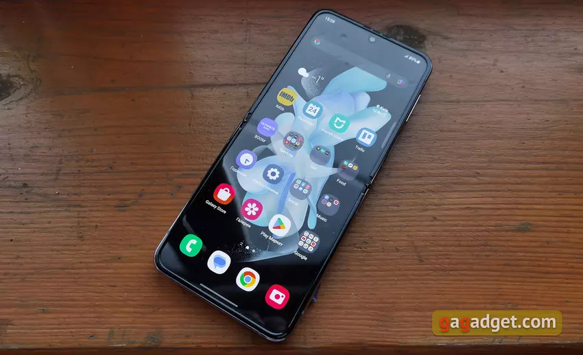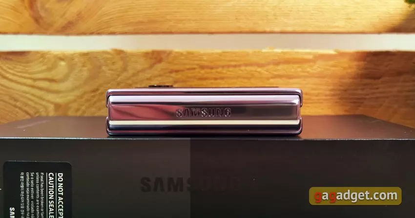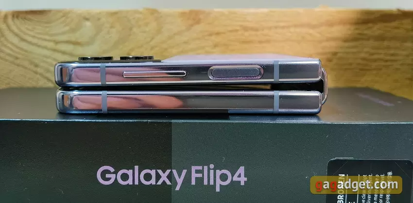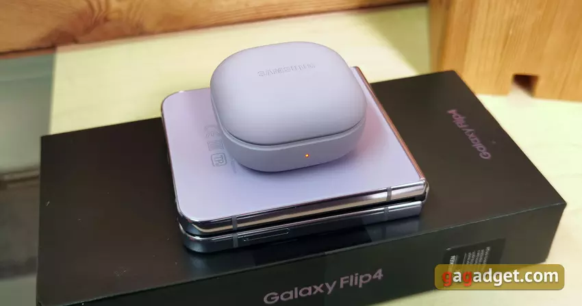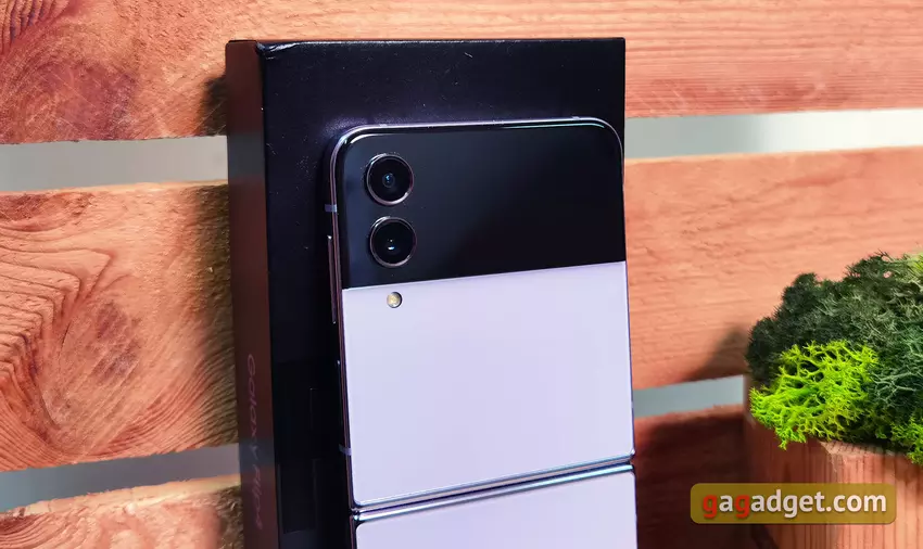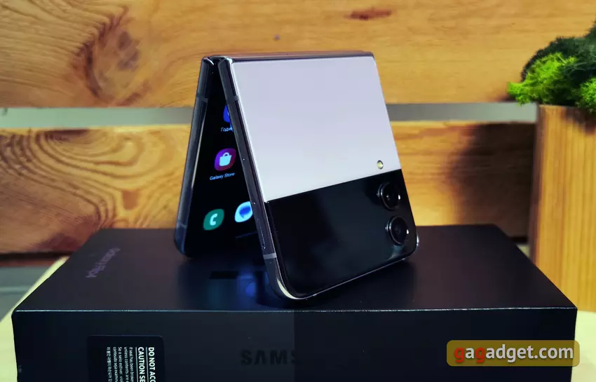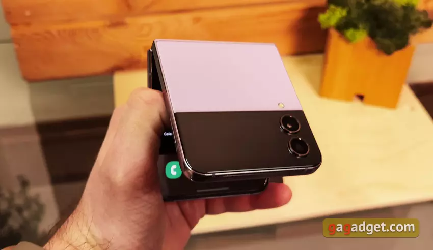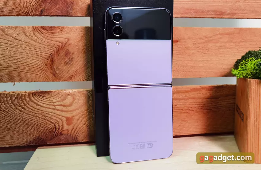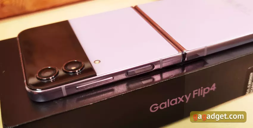 Het ontwerp van de Samsung Galaxy Flip4 blijft grotendeels ongewijzigd, met de bekende voor- en nadelen. Het is een clamshell met een klein buitenscherm en een groot flexibel binnenscherm. Opgevouwen is het een klein maar vrij dik vierkantje dat comfortabel in bijna elke zak kan worden meegenomen. Alle panelen zijn gemaakt van Gorilla Victus+ glas. Ze zijn mat in alle kleurvarianten. Er is een glanzende metalen rand, scharnier en een klein gebied met het buitenste scherm en de belangrijkste dubbele camera. Het binnenscherm heeft de bijna bekende langwerpige proporties. Het is moeilijk met zekerheid te zeggen zonder een Flip3 te hebben. Maar de rand rond de omtrek van het scherm lijkt behoorlijk te zijn gekrompen, evenals de beschermende rand. Verder is alles vertrouwd: boven het scherm zit de luidspreker, aan de bovenkant zit een rond gat voor de frontcamera. In het midden van het scherm voel je nog steeds de vouw. Helaas is het ons nog niet gelukt die weg te werken.