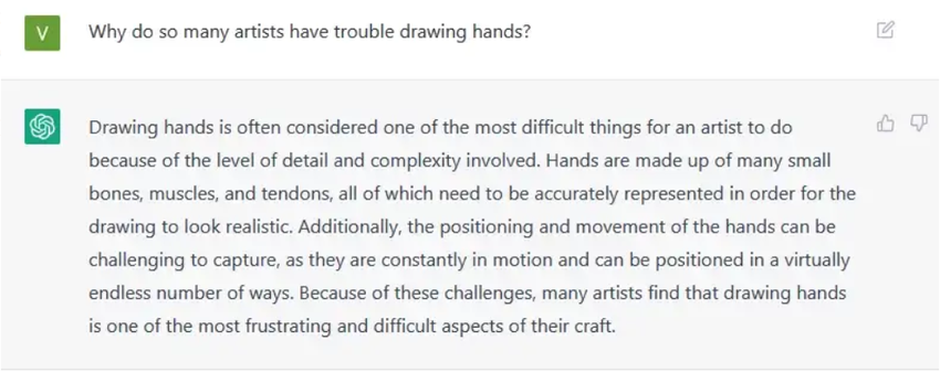 En als je ChatGPT vraagt waarom mensen het moeilijk vinden om handen en vingers te tekenen, antwoordt het het volgende: "Het tekenen van handen wordt vaak beschouwd als een van de moeilijkste elementen voor een kunstenaar vanwege het niveau van detail en complexiteit. Handen bestaan uit vele kleine botjes, spieren en pezen. En die moeten allemaal nauwkeurig worden weergegeven, wil de tekening realistisch zijn. Bovendien kan de positie van de handen moeilijk over te brengen zijn, omdat ze voortdurend in beweging zijn en op een oneindig aantal manieren gepositioneerd kunnen worden. Vanwege deze complexiteit beschouwen veel kunstenaars het tekenen van handen als een van de meest frustrerende en uitdagende aspecten van hun vak."