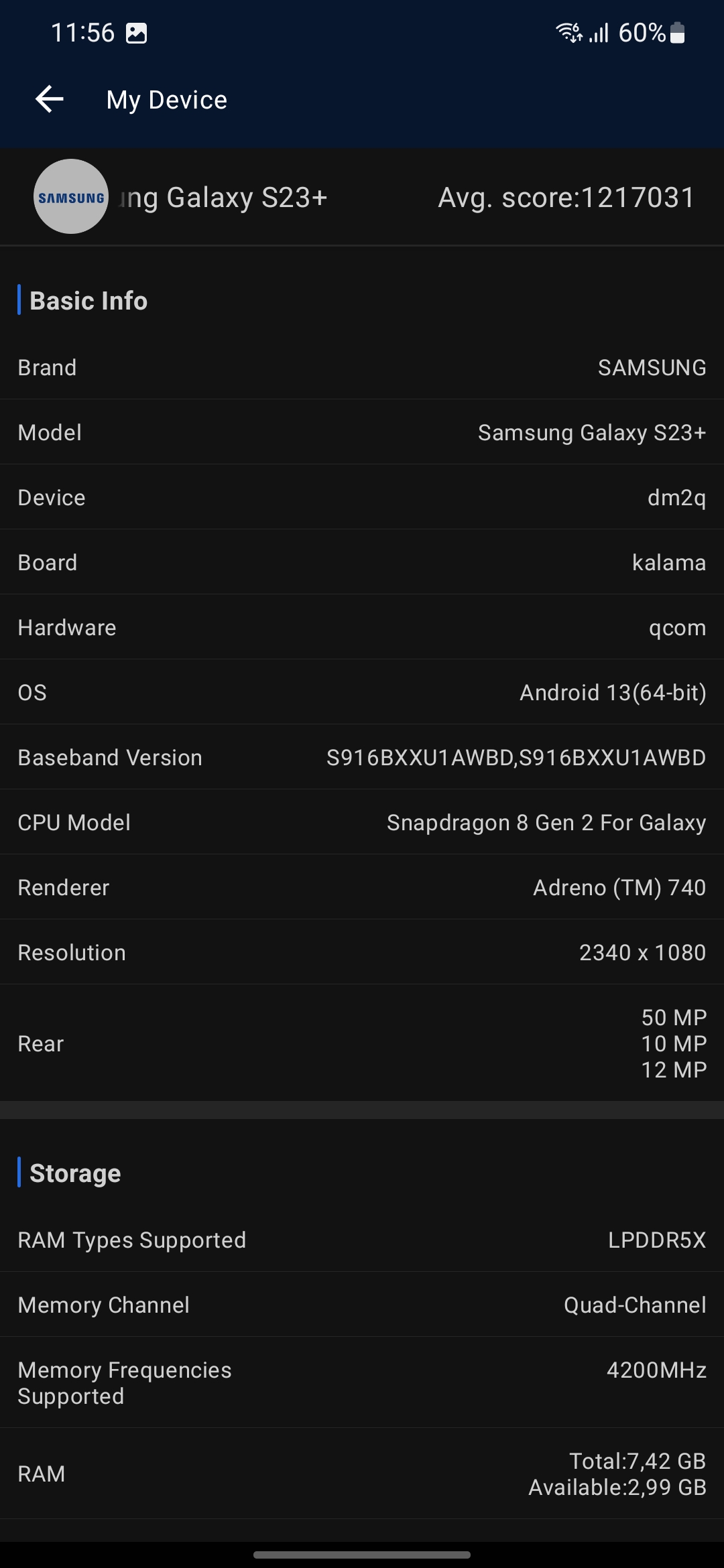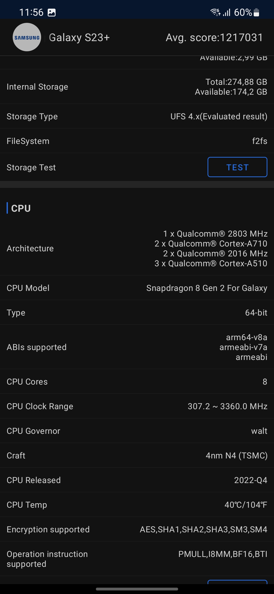De Samsung Galaxy S23 en Galaxy S23+ vlaggenschepen kregen in alle regio's de vlaggenschip-processor van Qualcomm. Namelijk de Snapdragon 8 Gen 2 Mobile Platform for Galaxy, een licht overgeklokte versie voor Samsung smartphones. We hadden het er al over in onze review van de Samsung Galaxy S23 Ultra. Om een lang verhaal kort te maken: het is een octa-core processor met een 1+2+2+3 core schema, die is vervaardigd met behulp van 4nm procestechnologie. Hij bevat een overgeklokte ARM Cortex-X3 kern tot 3,36GHz, twee 2,8GHz Cortex-A715 kernen, twee 2,8GHz Cortex-A710 kernen, drie 2GHz Cortex-A510 kernen en een 719MHz Adreno 740 real-time ray tracing grafische versneller. Het RAM kan 8GB LPDDR5X zijn. De interne opslag kan 128/256GB zijn voor de Galaxy S23 en 256/512GB voor de Galaxy S23+. Een belangrijk punt is het vermelden waard. Alle configuraties krijgen het nieuwste UFS 4.0 high-speed geheugen, behalve de 128GB Galaxy S23. Die gebruikt UFS 3.1. Beide smartphones laten zeer hoge prestaties zien in alle synthetische tests en het verschil tussen beide is minimaal. De prestatiereserve is goed genoeg voor de komende jaren. Het enige waar je op moet letten is het snelheidsverschil tussen UFS 4.0 en UFS 3.1. Het nieuwe geheugen toont een leessnelheid van ongeveer 3350MB/s en een schrijfsnelheid van ongeveer 1520MB/s. UFS 3.1 is respectievelijk 1725MB/s en 580MB/s. Samsung Galaxy S23+ prestatietests: