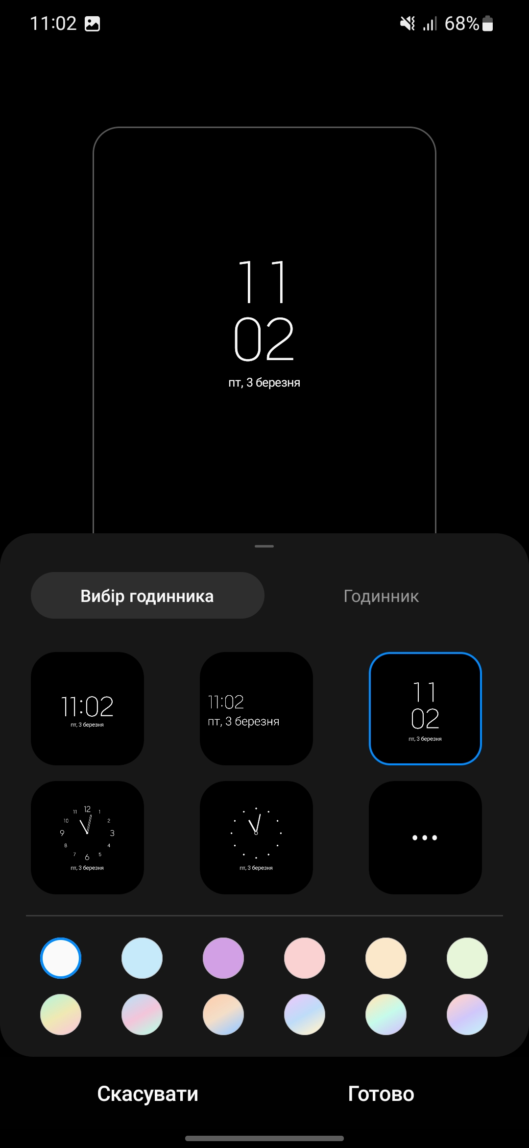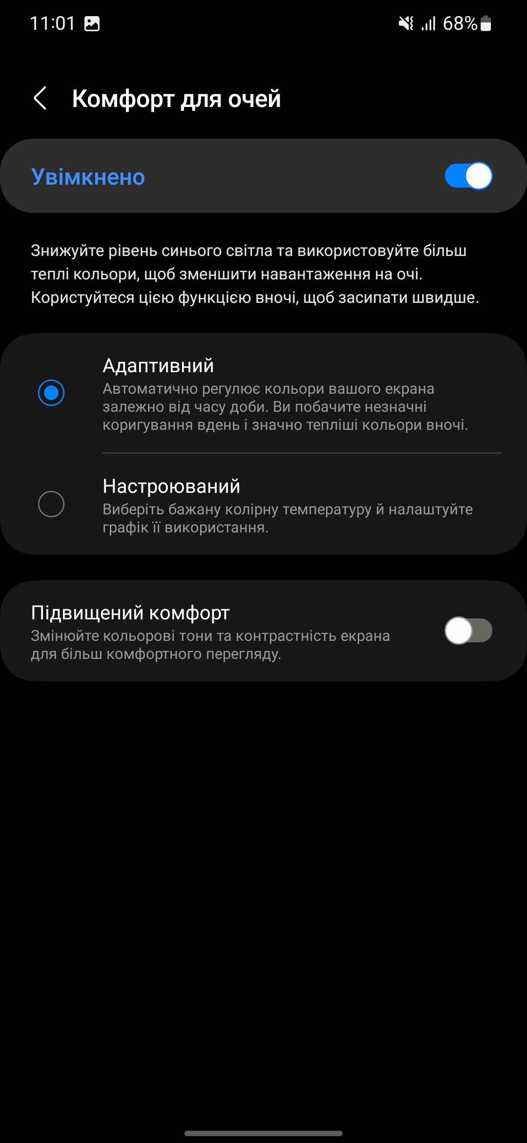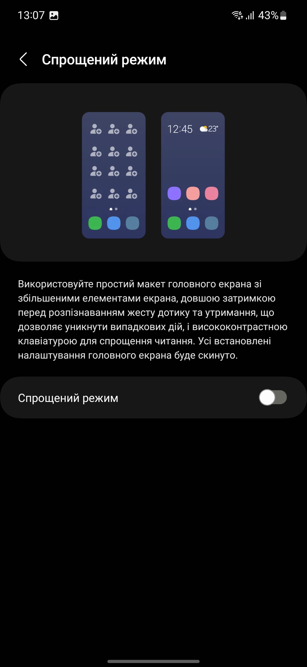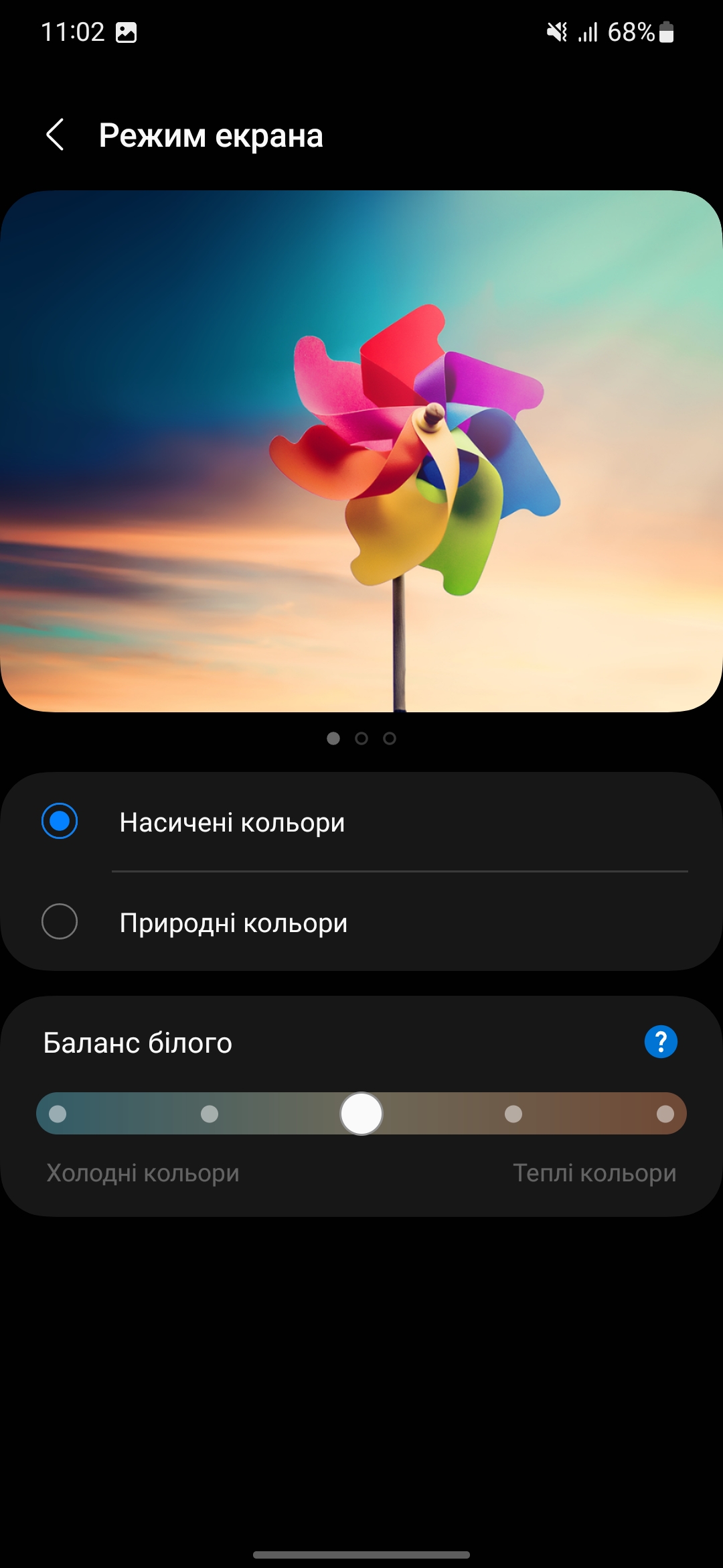 De set instellingen is vergelijkbaar met alle nieuwste vlaggenschepen van Samsung: keuze uit een licht of donker thema met de mogelijkheid om een schema in te schakelen, helderheid, schaal van interface-elementen, lettergrootte, "oogcomfort" (automatische aanpassing van de kleurtemperatuur afhankelijk van het omgevingslicht), modi voor kleurweergave (rijk en natuurlijk), updatefrequentie en Always on Display: