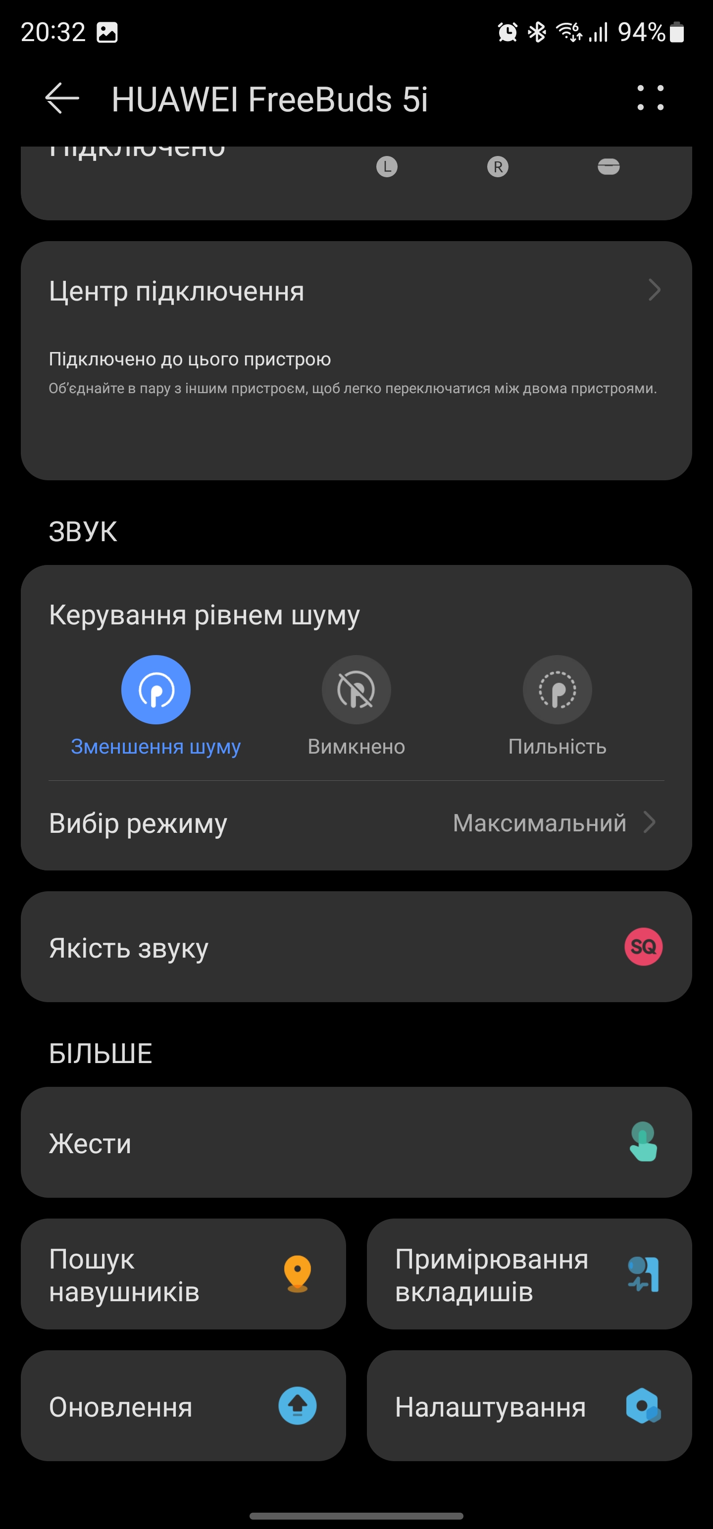 Er is een Huawei AI Life eigen app voor alle instellingen. Maar die is helaas niet beschikbaar op Google Play, dus je moet het APK-bestand downloaden van de officiële site door de QR-code in de instructies te scannen. Dit is niet erg handig. De app heeft een schakelaar voor ruisonderdrukking: ruisonderdrukking, uit en waakzaamheidsmodus (transparantiemodus). De ruisonderdrukking zelf heeft drie standen: maximaal, gebalanceerd en comfort. Er zijn ook touch gesture instellingen en software updates. Het verbindingscentrum is verantwoordelijk voor het instellen van het prioritaire apparaat en het schakelen wanneer twee apparaten tegelijkertijd zijn aangesloten. Onder Geluidskwaliteit kun je audiokwaliteit of verbindingsprioriteit selecteren. Hieronder staat de equalizer. Deze is erg rudimentair: in feite is er alleen de mogelijkheid om de lage of hoge tonen te versterken. Met "Headphone Search" kunt u het geluid op elke hoofdtelefoon afspelen. Dit is erg handig als een koptelefoon ergens in huis zoek is geraakt. Door de pasvorm van de koptelefoon te controleren, kun je het beste paar oordopjes vinden. Onder Instellingen kun je Slijtagedetectie activeren: het afspelen wordt automatisch gepauzeerd als je het oortje uit je oor haalt. Hieronder kun je lage geluidsvertraging activeren en zien welke codec wordt gebruikt voor de overdracht.