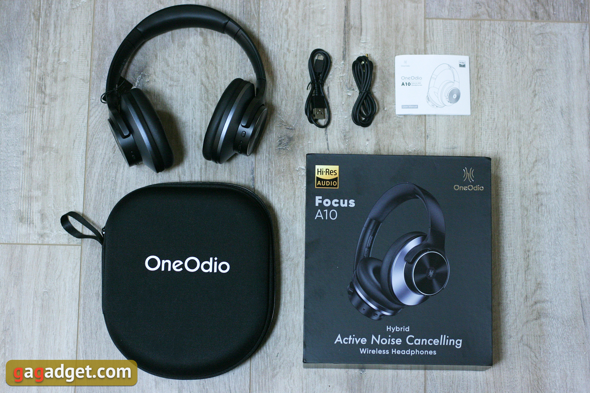 Het pakket van de OneOdio Focus A10 bevat de hoofdtelefoon, een hard zakje met rits om hem in op te bergen, een USB-C naar USB-A kabel voor het opladen, een mini-jack naar mini-jack audiokabel voor bedrade aansluiting en instructies. De doos is overigens behoorlijk respectabel, dik karton, selectieve lak - geen schande, in het algemeen. Het zakje is ook erg handig voor een huishouden, hoewel het stof zich gemakkelijk hecht aan het textieloppervlak.