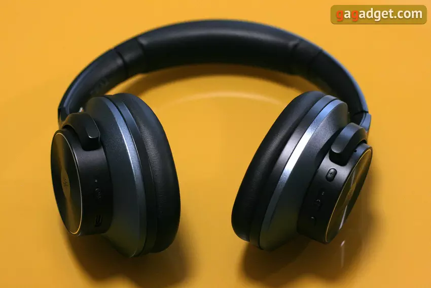 De rest van de buitenkant van de cups is bedekt met een blauwe metallic afwerking. Binnenin zijn de oorkussens voorzien van zeer zachte eco-leren kussentjes, en de luidsprekers zijn bekleed met schuim en stof, gemarkeerd met "R" en "L" voor respectievelijk de rechter en linker oordopjes. De hoofdband wordt beschermd door zwart mat plastic met het OneOdio-logo op de bovenkant. Hij is in grootte verstelbaar met een klassiek metalen mechanisme, de verandering van grootte gaat gepaard met een aangename klik. De hoofdband is gewatteerd en bekleed met hetzelfde aangename eco-leder.