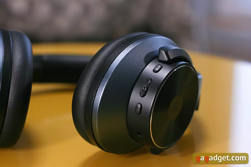 De vierde knop bevindt zich op het linkeroorstuk en is verantwoordelijk voor de ruisonderdrukking. Door erop te drukken kunt u schakelen tussen de modi transparantie, actieve ruisonderdrukking en normaal geluid.