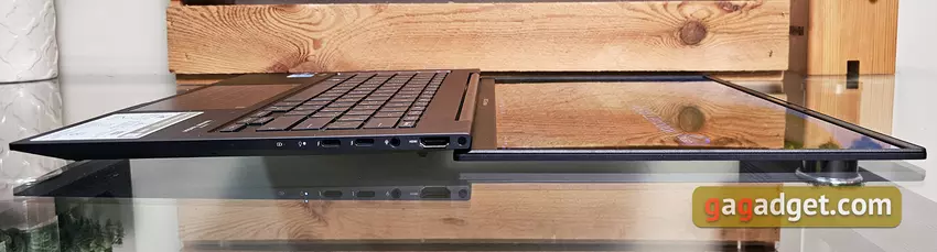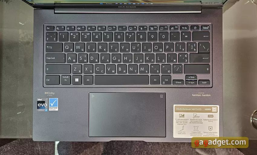 Het meest interessante deel zit binnenin de laptop. Het heeft Intel's nieuwe 13e generatie Raptor Lake processor. In ons geval is het een Intel Core i7-13700H. Meestal worden H-serie processoren gebruikt in de meer "massieve" draagbare werkstations en gaming laptops, terwijl de zoals de ASUS Zenbook 14X OLED (UX3404VA) ultradraagbare modellen de lagere prestaties, energie-efficiënte U of P-serie processoren krijgen. De Intel Core i7-13700H is vervaardigd met behulp van Intel 7 processortechnologie, heeft een TDP van 45W en een 24MB cache. De configuratie van de kernen is vergelijkbaar met de overeenkomstige processoren van vorig jaar. Namelijk: 6 prestatiekernen op 2,4-5GHz en 8 energiezuinige kernen op 1,8-3,7GHz. Er is ondersteuning voor multi-threaded computing: tot 20 threads. Er is 16GB LPDDR5-4800 RAM. Het is ongesoldeerd op het bord, dus het kan niet worden uitgebreid. In deze configuratie is er geen discrete grafische kaart, alleen Intel Iris Xe embedded .Deze heeft 96 actuatorblokken en kan een maximale frequentie van 1500MHz bereiken. Er is een krachtigere laptopconfiguratie met een Intel Core i9, 4GB NVIDIA GeForce RTX 3050 laptop graphics en 32GB RAM. Draadloze interfaces zijn Wi-Fi 6E (802.11ax) en Bluetooth 5.2.